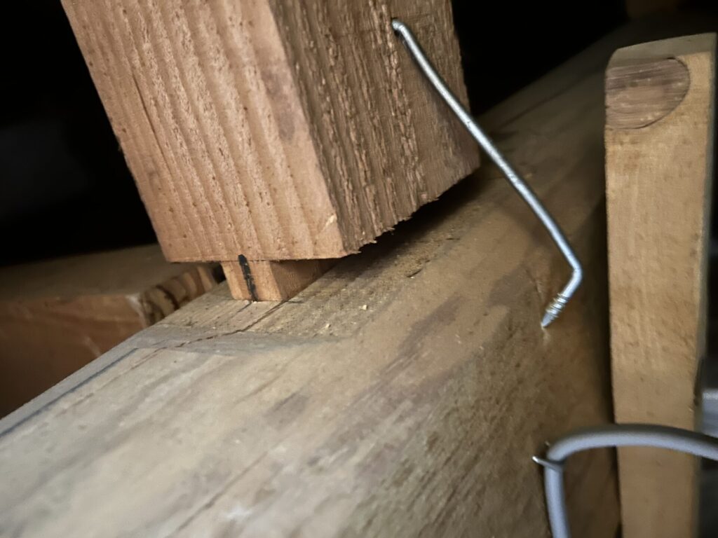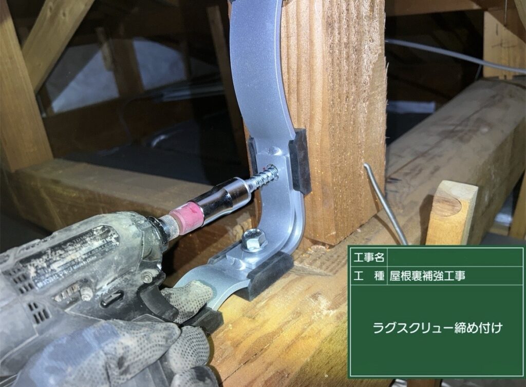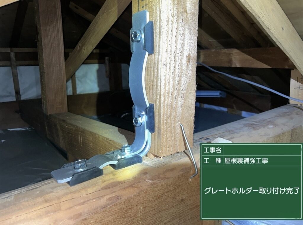 今回の工事は屋根裏でほぞ抜けを起こしている箇所に「グレートホルダー」という強力な緊結金物の取り付けを行いました。