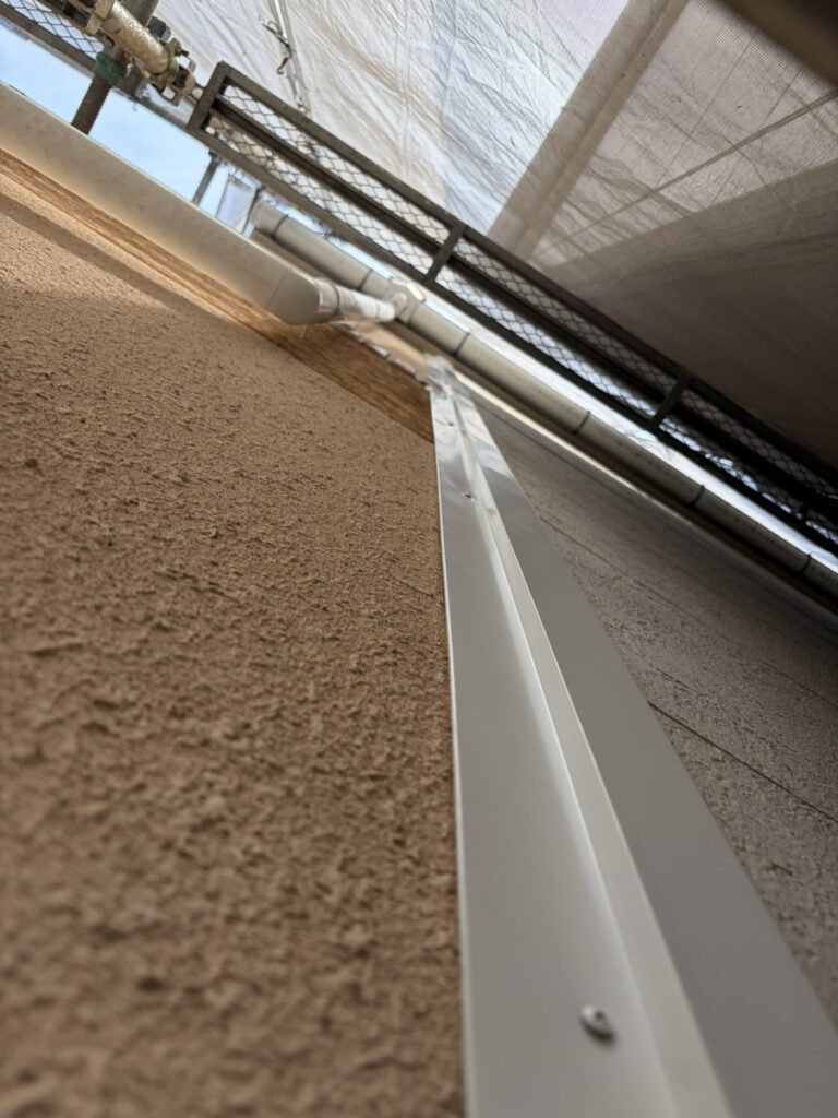 まずは既存のひび割れ部分の状態をしっかり確認し、下地の劣化状況や水の侵入の有無をチェックします。表面上のクラックだけでなく、内部にまで影響が及んでいるケースもあるため、この工程は非常に重要です。 その後、施工箇所の清掃および下地調整を行い、板金を取り付けるための準備を進めます。今回の現場では既製品では対応できない形状だったため、職人が一から寸法を測り、現場に合わせた板金を加工しました。