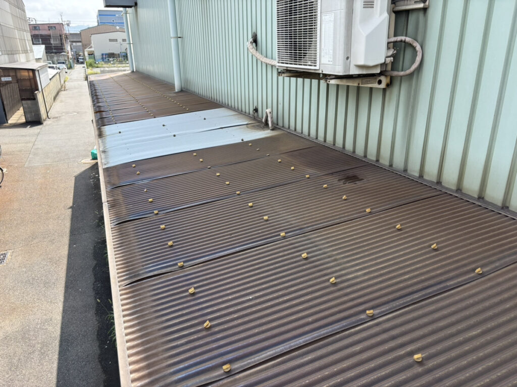 また、今回の現場では配管との干渉箇所が複数ありました。既製品のままでは納まらないため、現場に合わせて波板を加工し、隙間ができないよう調整しています。その上でシリコンによるシーリング処理と防水テープを併用し、確実に防水処理を施しました。こうした細部の処理が、雨漏り防止には非常に重要です。 すべての波板を張り終えた後は、最終チェックを実施。固定状況や隙間の有無、防水処理の仕上がりを細かく確認し、問題がないことを確認して施工完了となります。