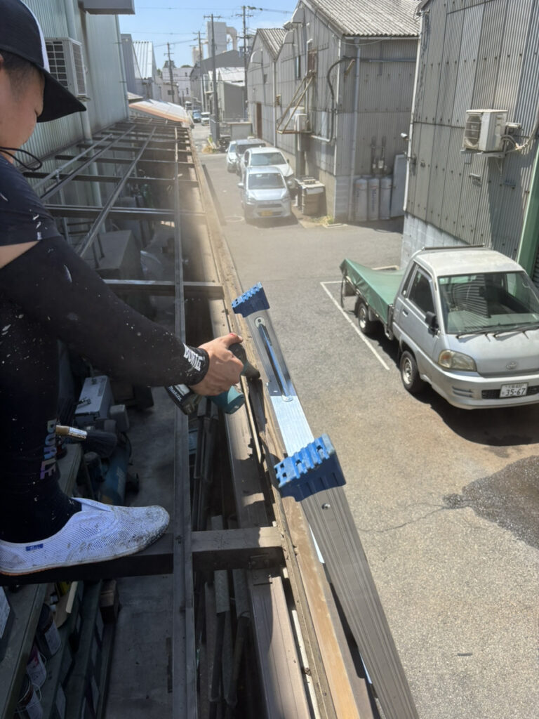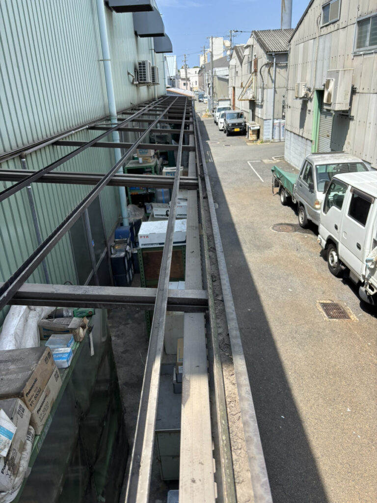 まず既存の波板を丁寧に撤去し、下地の状態を確認します。鉄工所という特性上、屋根には粉塵や油分が付着していることも多く、しっかりと清掃・下地調整を行うことが重要です。下地の状態が悪いまま施工を進めると、固定不良や雨漏りの原因となるため、この工程は特に慎重に行いました。 ここで非常に重要なのが、波板撤去後の「樋フレーム内の清掃」です。長年蓄積されたゴミや粉塵、サビ片などが溜まっているケースが多く、この部分をしっかり清掃しないまま新しい波板を施工してしまうと、排水がうまく機能せず雨水がオーバーフローする原因になります。せっかく新しい波板に交換しても、こうした見えない部分の処理を怠ると不具合につながってしまいます。 実際、業者様によってはこの工程を省略してしまうケースもありますが、当社では必ず徹底して清掃を行い、排水機能まで含めた「本来の性能」をしっかり回復させる施工を心がけております。