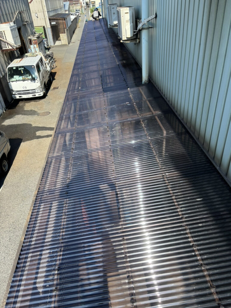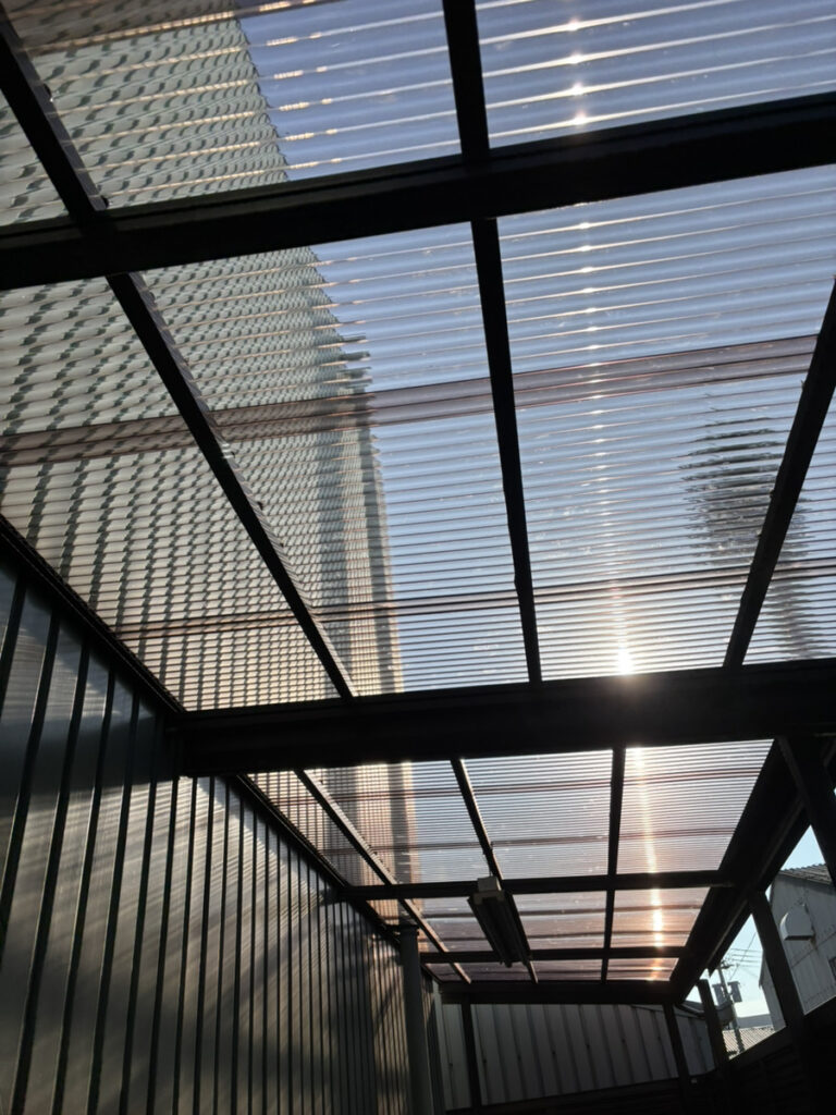 今回使用したのはポリカーボネート製の波板です。従来の塩ビ波板と比べて耐候性・耐衝撃性に優れており、長期間にわたり安心してご使用いただけます。特に工場や鉄工所のような環境では、強度の高い素材選びが重要です。