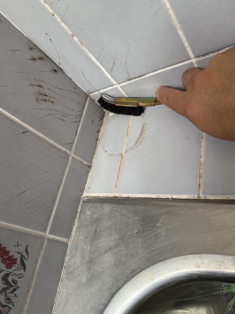 撤去後の溝をしっかり掃除し、水分や汚れを除去。ここで乾燥が甘いと再びカビが発生するので大事な工程です。