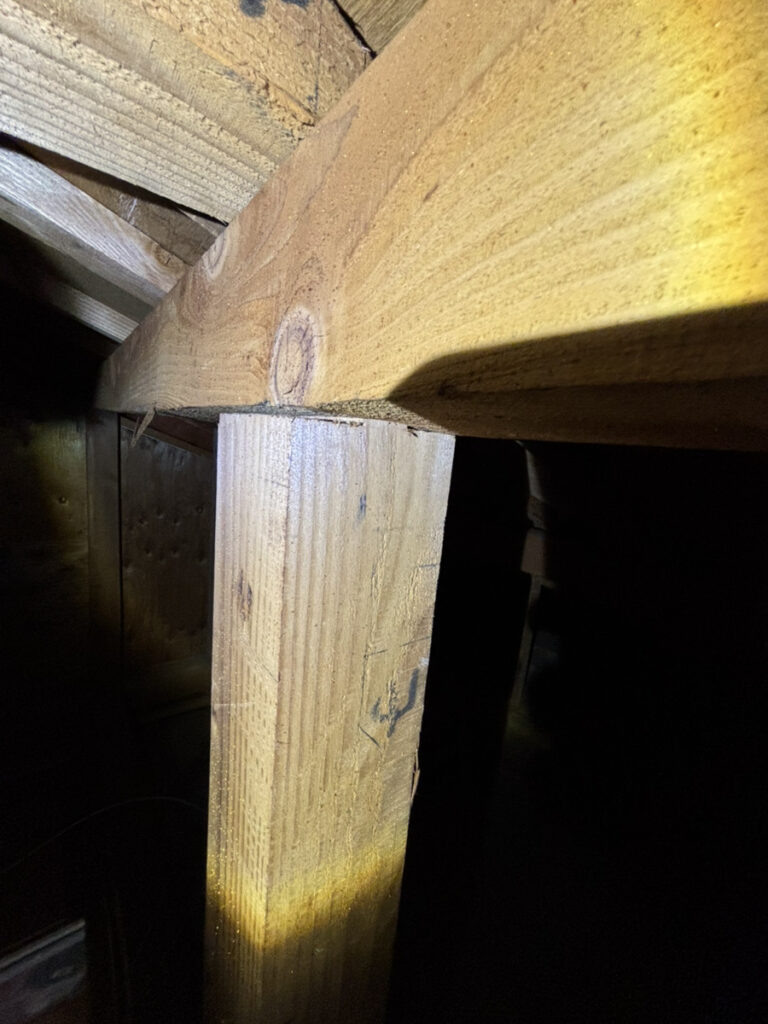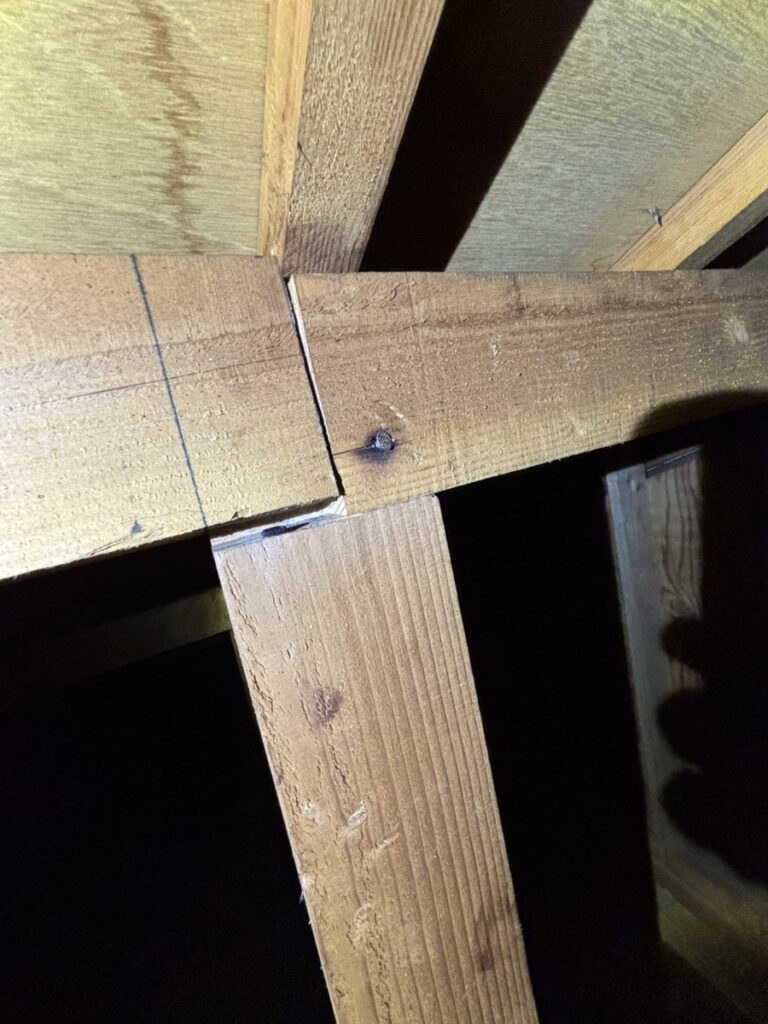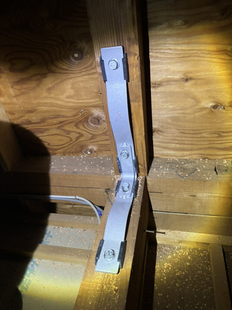 今回は顧客様からのご依頼で、耐震補強の金物工事を行いました。あわせて屋根裏の点検も実施し、建物の現状を詳しく確認させていただきました。 点検の結果、特に母屋のズレが大きく見られ、構造的にも影響が出ている状態でした。