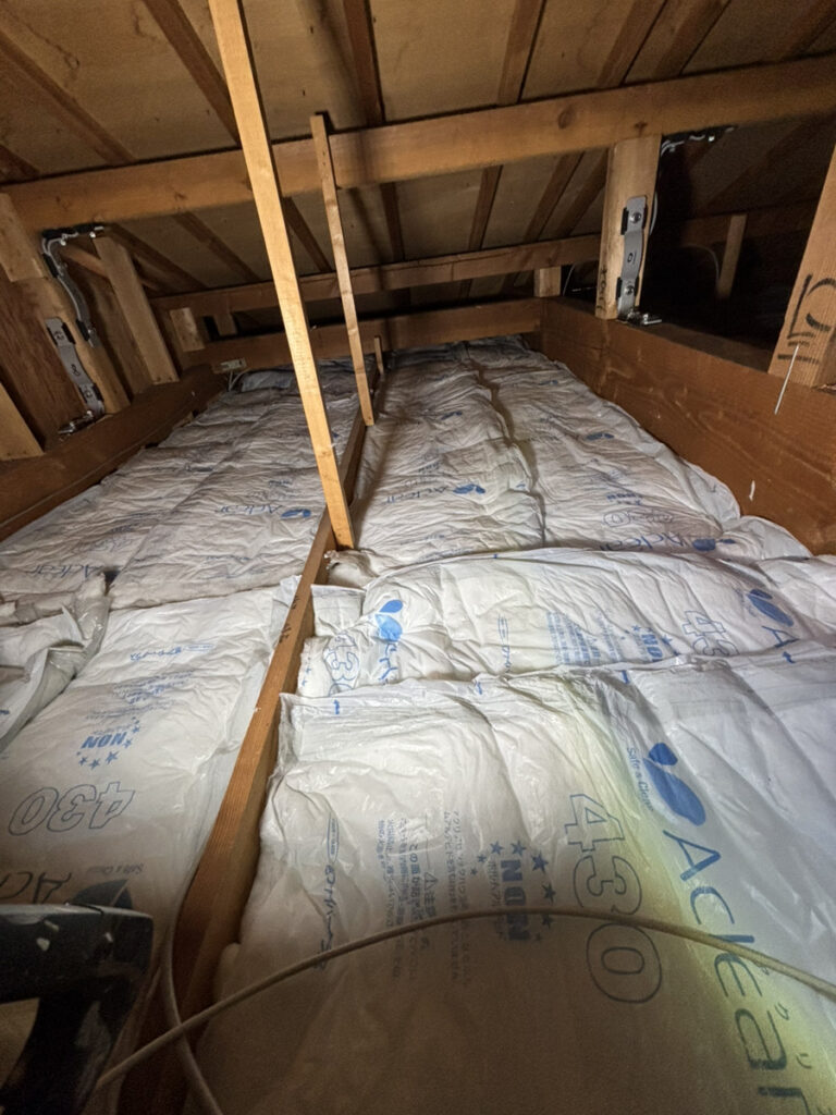 又、お客様より「室内が寒い」とのご相談もいただいていたため、今回の工事にあわせて屋根裏へ断熱材の敷設工事も実施しました。これにより、冬場の冷気の侵入を軽減し、室内環境の改善も期待できます。 耐震性の向上と断熱性能の改善を同時に行いました。
