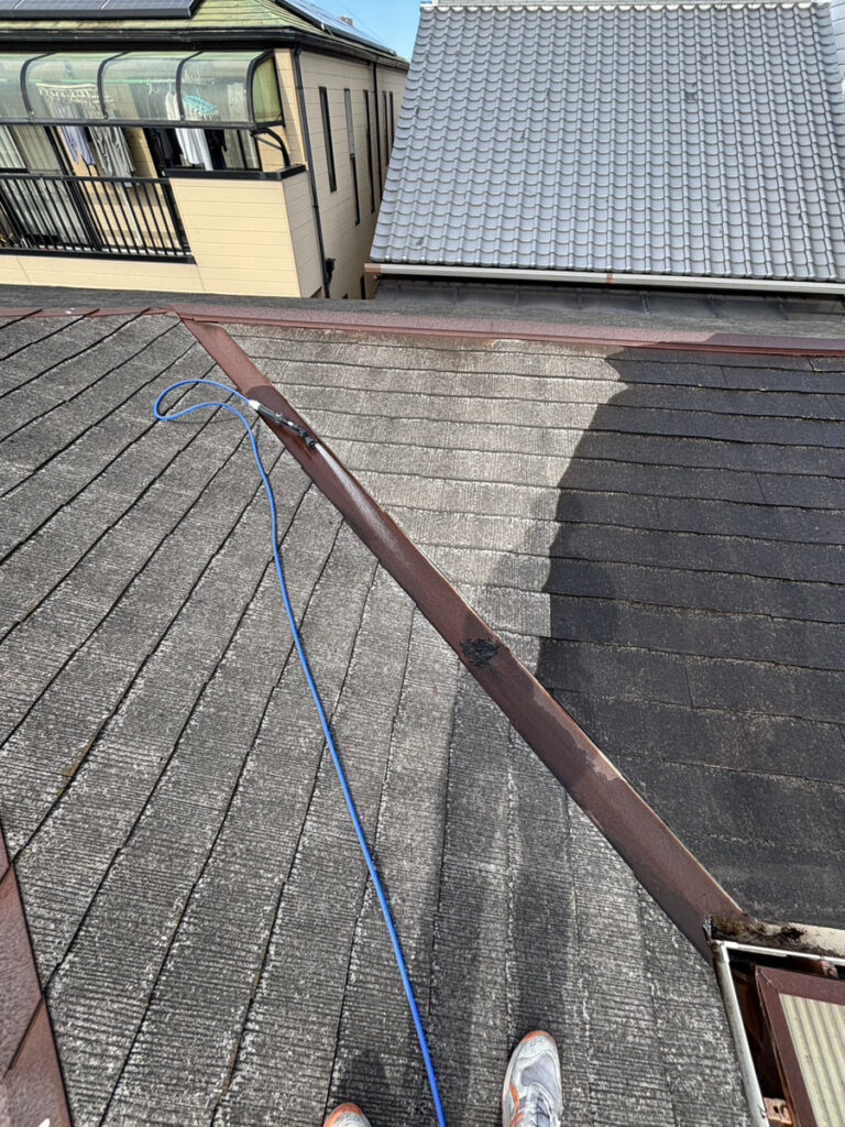 調査の結果、屋根の谷板金部分からの浸水が確認され、そこから雨水が侵入し、2階の壁の中を通っていき1階天井へと漏れ出していることが判明しました。谷板金は雨水が集中しやすく劣化しやすい箇所のため、早期の補修が重要です。