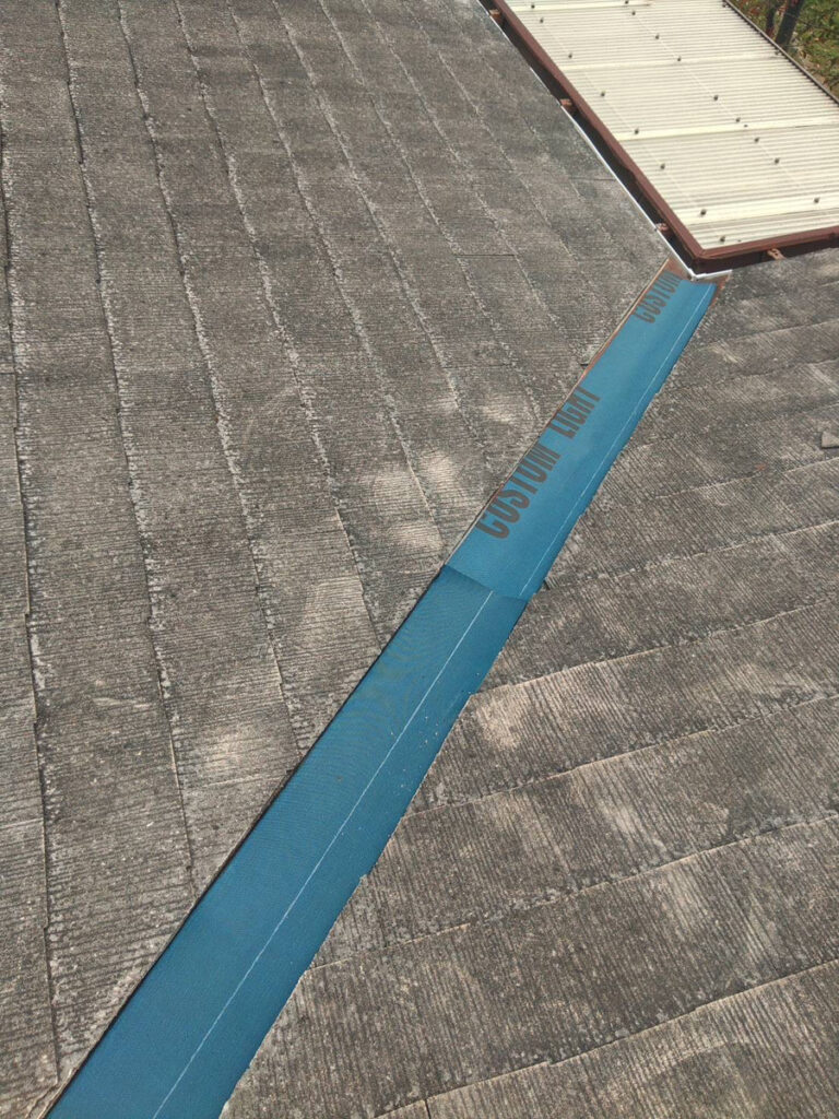 極力費用を抑えてほしいとご相談受けていましたので周辺のスレート瓦は捲らずガルバリウム板金を使用し、I様邸専用の谷板金を加工→取付を行いました。万が一水が入っても中にルーフィング【防水紙】入れてますので、雨漏りの心配はないですね。【雨漏り保証5年】